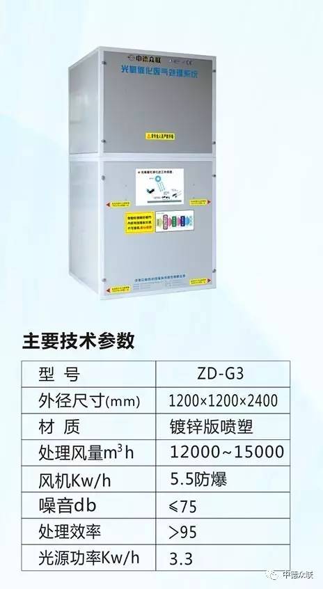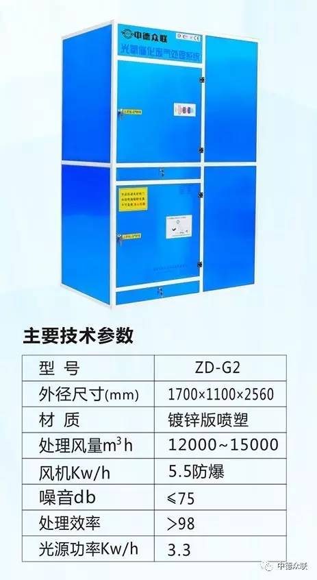 鍍鋅板噴塑制作,機柜用雙層蒙板,尺寸1200*1200*2300,配初效中效高效及88塊蜂窩狀活性炭加3kw光氧,處理風量15000m³/h,排風機YDW7.5kw |